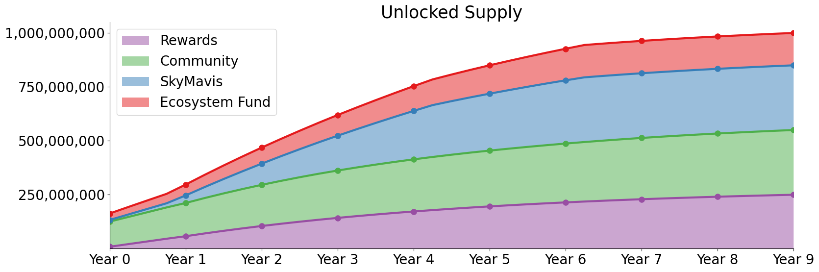 | Month | Rewards | Community | Sky Mavis | Ecosystem Fund | Total unlocked supply | Unlocked supply % |