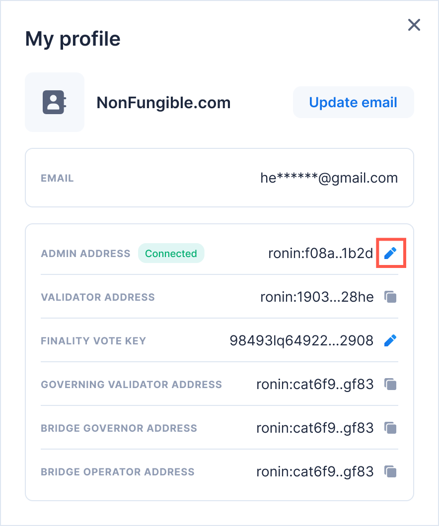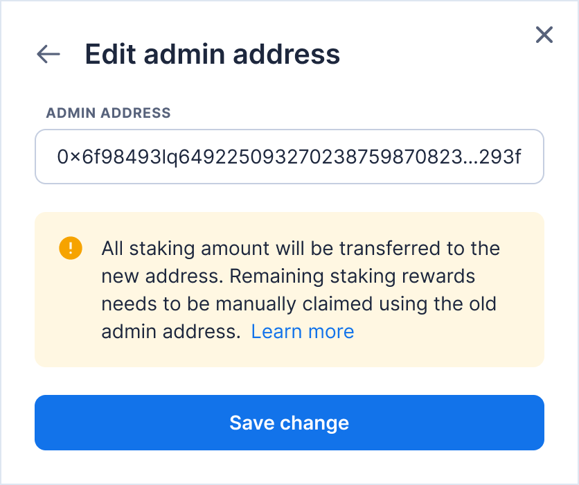 You can change your admin address, used for managing your profile, staking activities, and claiming rewards.