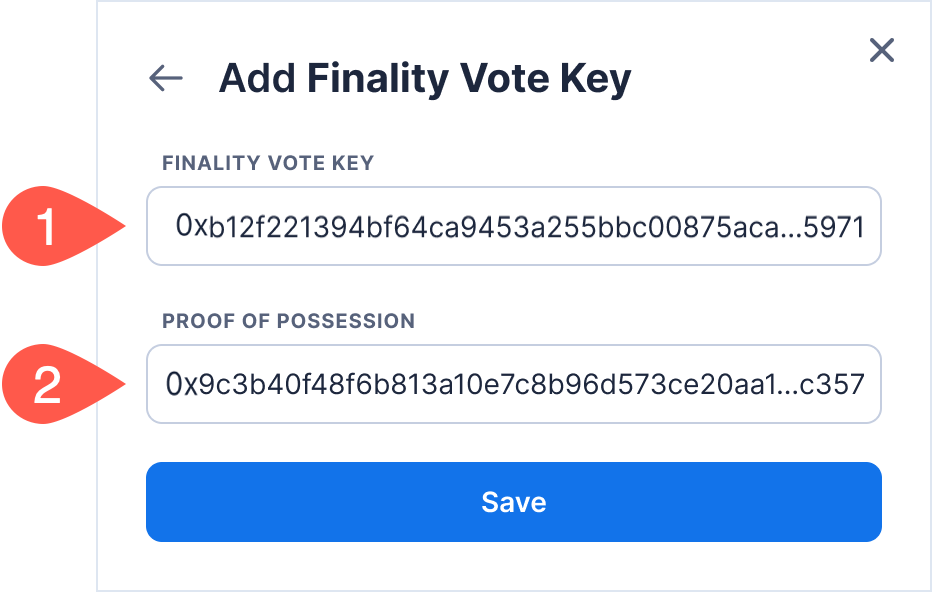 Before you add a finality vote key, you need to generate a BLS key pair. The BLS key pair consists of a private key and a public key. The public BLS key is your finality vote key. For more information, see the Generate BLS key pair guide.
